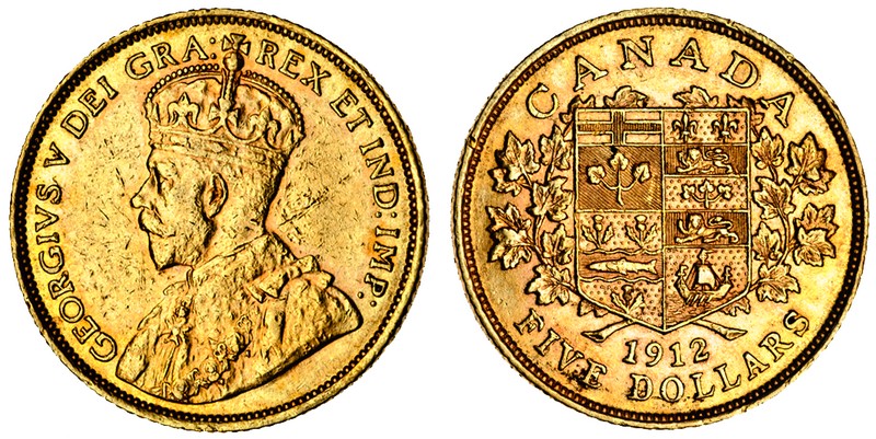 (g) Canada, George V (1910-36), 5-Dollars, 1912, crowned bust left, rev. shield (F.4; KM.26), very fine