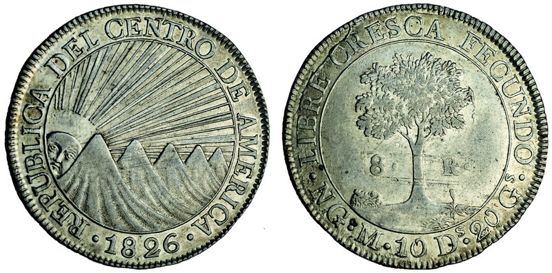 Central American Republic, 8-Reales, 1826 NG M, sun over mountains, rev. tree dividing value (KM.4), extremely fine