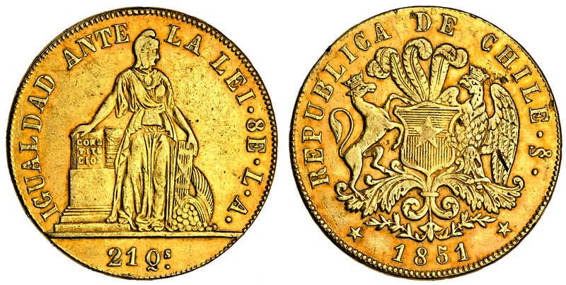 (x) Chile, Republic, Santiago, 8-Escudos, 1851 LA, Pallas standing, rev. arms, edge mayo (F.41; KM.105), metal flaws on reverse, very fine