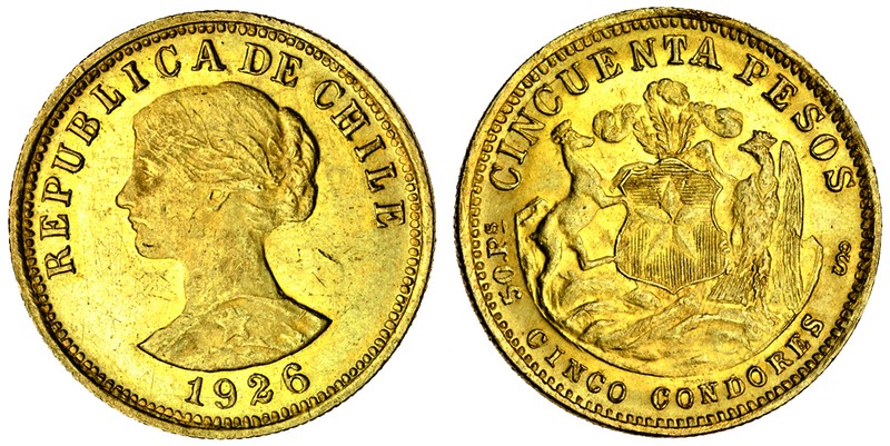 (g) Chile, Republic, 50-Pesos, 1926, head of Liberty left, rev. arms (F.55; KM.169), small graze on reverse rim otherwise extremely fine