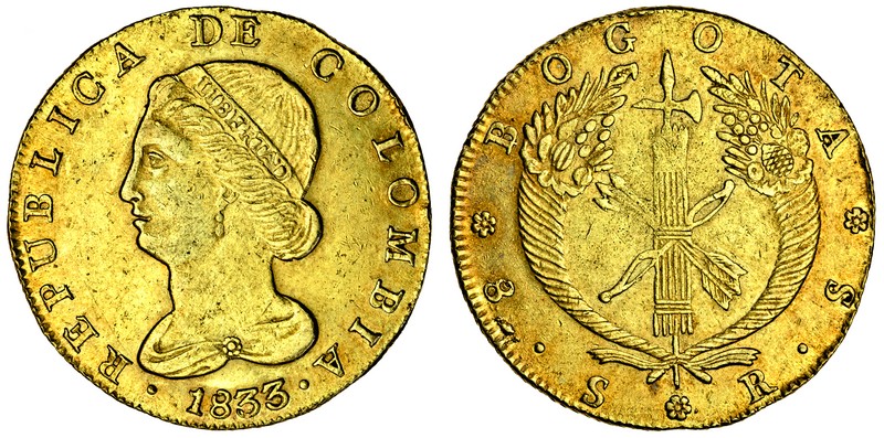(x) Colombia, First Republic (1821-37), Bogota, 8-Escudos, 1833 RS, head of Liberty left, rev. fasces and cornucopias (F.467; KM.82.1; Restrepo 165), very fine
