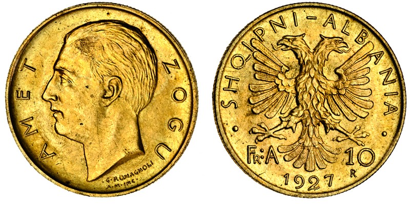 (g) Albania, Zog (president 1925, king 1928-39), Rome, 10-Franga Ari, 1927 R, head left, rev. double headed eagle (F.3; KM.9), extremely fine