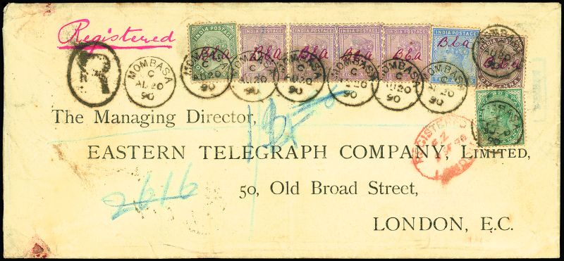 1890 (20 Aug.) Eastern Telegraph Company Limited printed envelope (227x104mm.) registered from Mombasa to London, bearing ½a. blue-green, 1a. plum, 2a. blue, 8a. dull mauve (4) and 1r. slate, (a total of 51½a. and appearing to pay 11 times the 4½a. rate to the U.K. plus registration fee of 2a.), all but the first initialled "B.E.A." in red ink and all neatly cancelled with c.d.s., showing manuscript "Registered" in the same red ink alongside oval-framed "R" and with London Registered oval d.s. (9.9) in red additionally tying the ½a., the reverse with Aden transit c.d.s. (26.8); vertical fold towards left clear of the adhesives. A unique and colourful franking of Indian stamps used in Mombasa, being the record equalling earliest recorded date of the six covers recorded during this first period of use. Photo