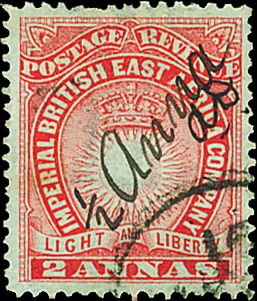 "½ Anna" on 2a. vermilion with original face value not obliterated, unusually well centred and with small part c.d.s. at lower right corner; a couple of short perfs. at top, otherwise fine. A most attractive example of this rare stamp of which no unused examples are recorded. Brandon Certificate (2000). S.G. 22, £3,250. Photo