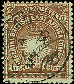 "1 Anna" on 4a. brown, neatly cancelled by light Mombasa c.d.s. (30.5); fine. Rare. S.G. 26, £1,700. Photo