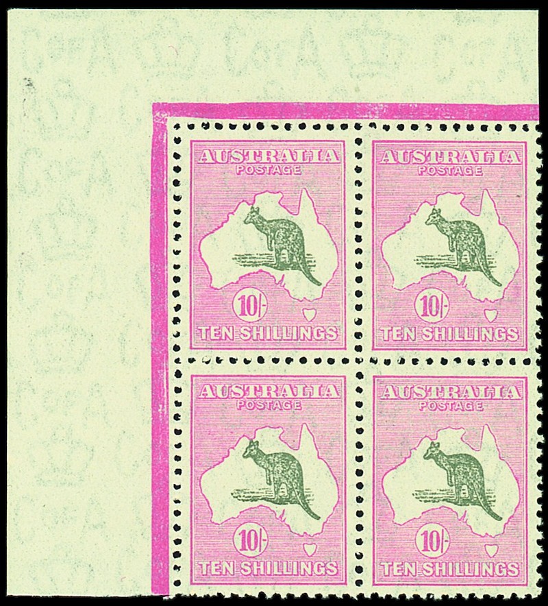 1931-36 10/- grey and pink in an upper left corner block of four, lightly mounted in the top margin only; well centred. Fine. S.G. 136; HB 50. Photo