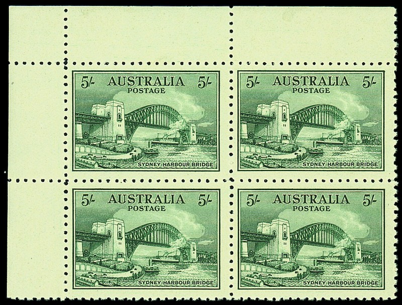 1932 Sydney Harbour Bridge 5/- dark green in an upper left corner block of four, mounted in the top margin only. Fresh mint. S.G. 143. Photo