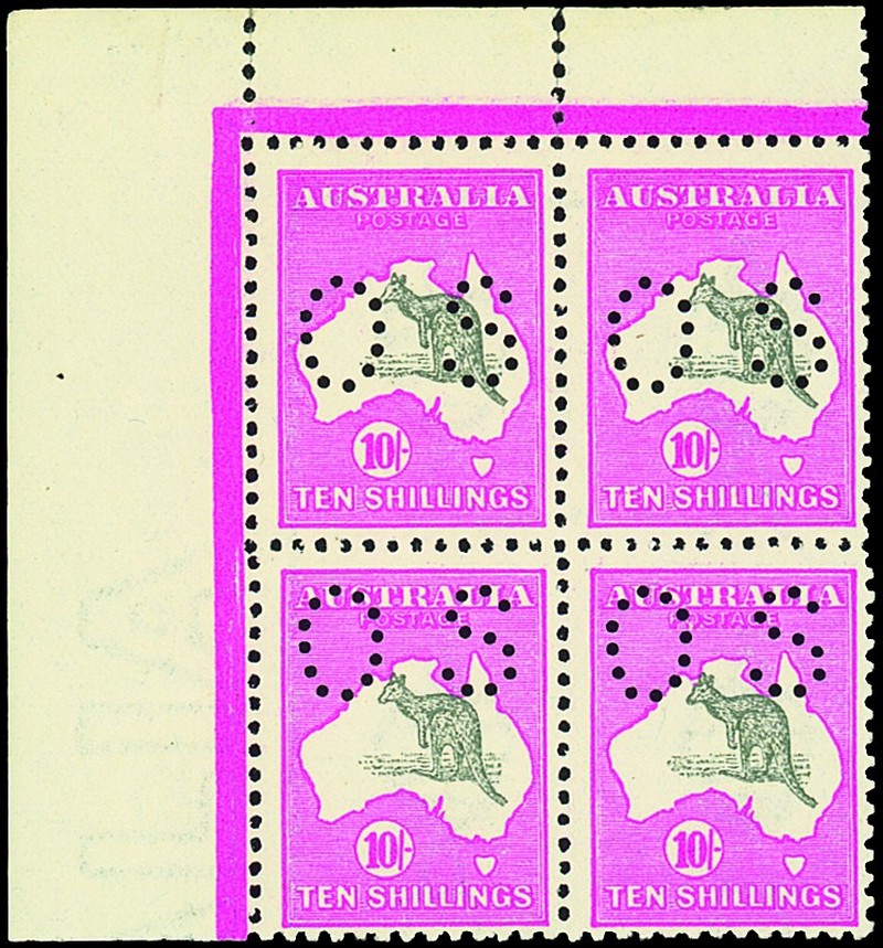 1915-26 10/- grey and intense aniline pink in an upper left corner block of four, lightly mounted in the top margin only and showing "...ALIA" watermark in the margin; a few split perfs. in the top margin. Fine and scarce. S.G. O51; BW 48ba. Photo