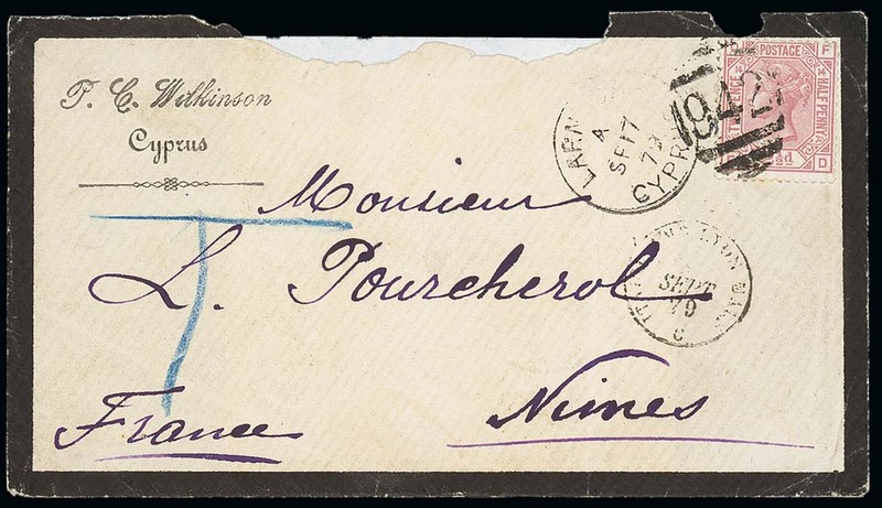 1879 (17 Sept.) mourning envelope (small portion torn away at top) from Larnaca to France, bearing G.B. 2½d. rosy mauve Plate 14 clearly cancelled "942" and with partially fine Larnaca c.d.s. alongside with French transit c.d.s. below, marked with large "T" in blue, though with no Postage Due apparently necessary, and showing, on reverse, Naples (27.9) and Nimes (29.9) c.d.s.. Also loose 2½d. rosy mauve Plate 11 similarly cancelled
