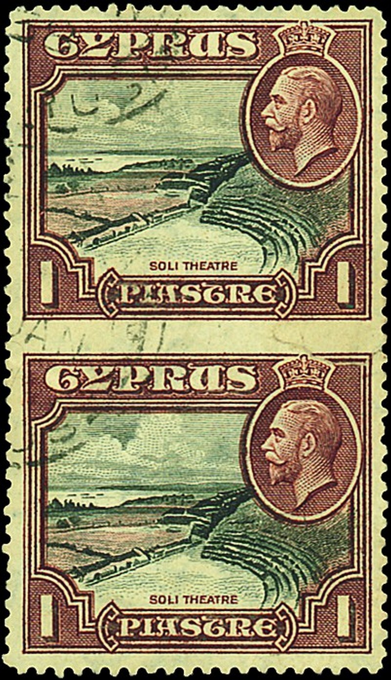 1934 1pi. black and red-brown vertical pair, variety imperforate between, neatly cancelled with two small part c.d.s.; 10mm. tear at right through having been tried to be separated, just affecting the design of the lower stamp which has some creasing. Exceptionally rare and apparently one of only two used examples of this variety recorded. S.G. 136a, £25,000. Photo