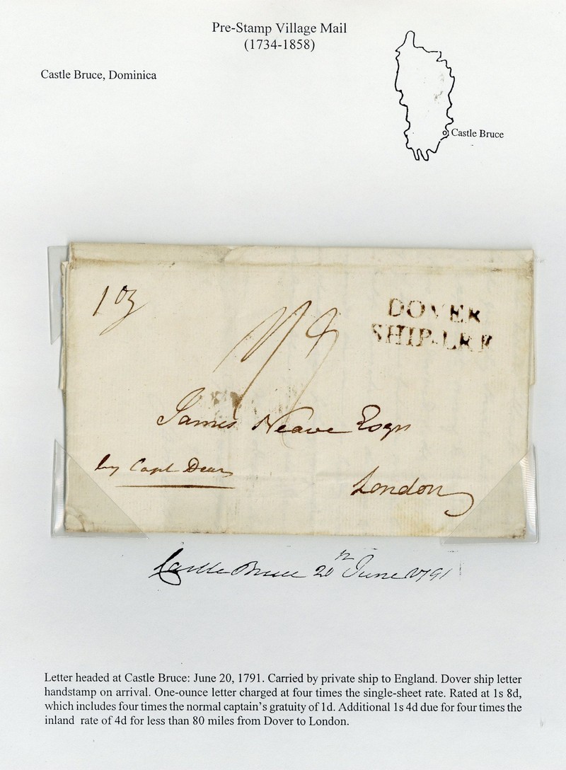 1791 (20 June) entire letter from Castle Bruce to James Neave Esq. London", endorsed "1oz" and "by Capt Dean", rated "1/9" and with "dover/ship-lre" (Robertson S?), arrival datestamp on reverse, across flap; fine. Photo
