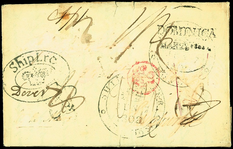 1802 (18 Mar.) entire letter ex the Steele correspondence to Edinburgh (name and address reduced), showing various rate markings "dominica" two line datestamp (HS5), light "ship letter/london" datestamp (Robertson S.13, deleted) and double lined oval "Ship Lre/(Crown)" handstamp with blank area for the port and with manuscript "Dover" inserted (Robertson S.7l); A major rarity and exhibition item. Believed to be the only known example. Photo