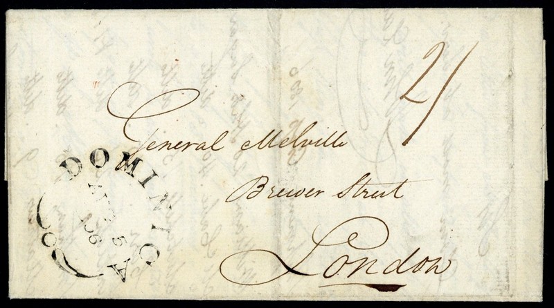 1806 (5 Aug.) entire letter ex the Melville correspondence to London, rated "2/ " and with a good strike of the large "dominica" dated fleuron (HS6), arrival datestamp (24.9) on reverse; fine. Photo