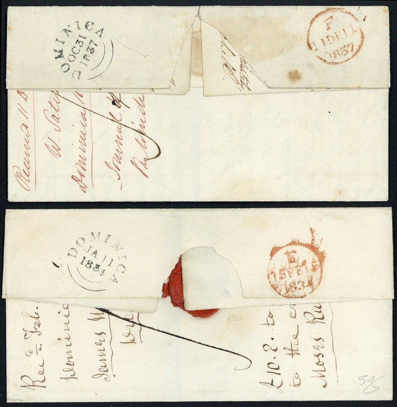 1834 (11 Jan.) entire and 1837 (31 Oct.) entire letter to the same address in London, both rated "2/2 and with "dominica" double-arc datestamps (HS8), red arrival datestamps in reverse,