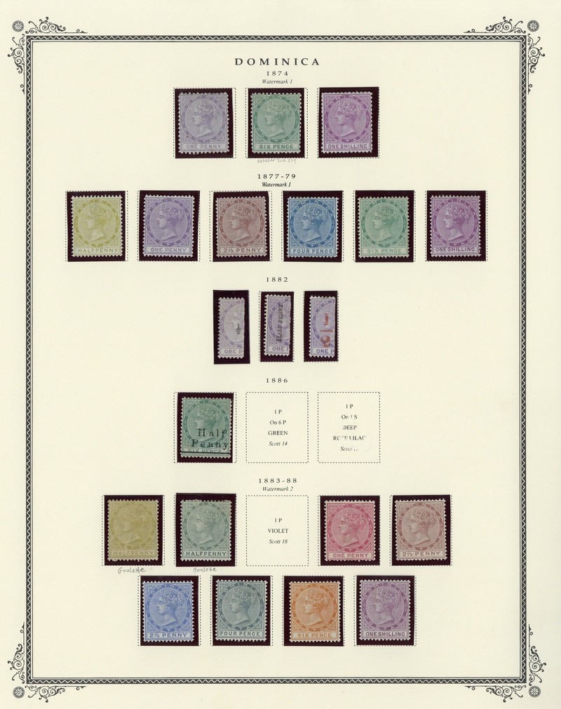 1874-90 mint collection on pages, thirty-one stamps including 1874 1d. lilac, 6d. green, 1/- dull magenta, 1877-79 2½d. red-brown (regummed), 4d., 6d. and 1/-, 1882-83 small "½" on half 1d., "Half Penny" on half 1d., 1883-86 2½d. red-brown, 1886-90 ½d. to 5d. overprinted "specimen", 1879-88 Revenue stamps, etc., chiefly fine