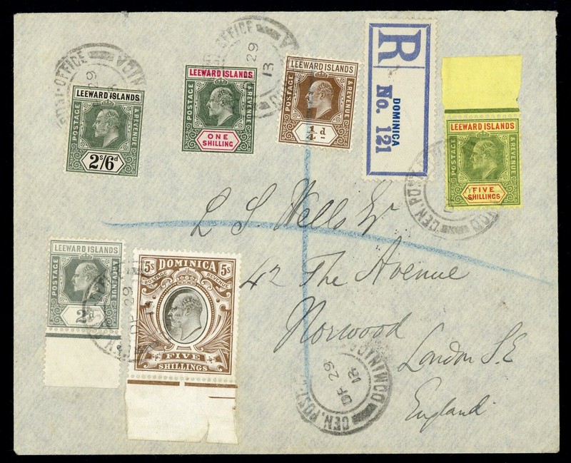 1907-08 5/- black and brown from the foot of the sheet, used with Leeward Islands 1907-11 ¼d., 2d., 1/-, 2/6d. and 5/- on 1913 (29 Dec.) Royal Mail Steam Packet Company envelope registered to London, arrival datestamps (21.1.) on reverse; fine. S.G. 46, etc. Photo