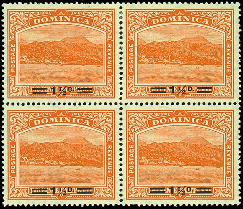 1920 (June) 2½d. on 2½d. orange, block of four, the third stamp with variety "A" of "CA" missing from watermark, lightly hinged, the variety unmounted mint, fine. S.G. 60b, £600. Photo