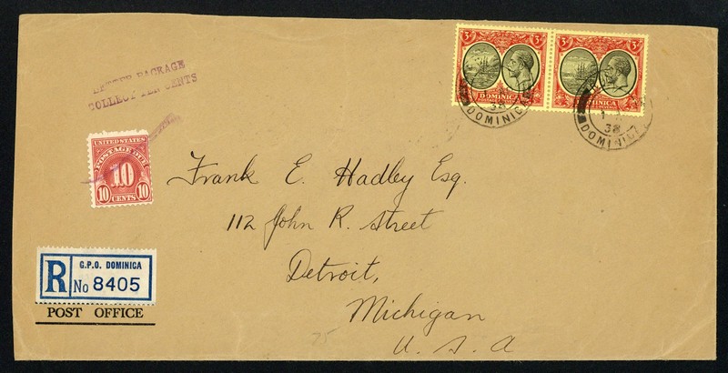 — 1931 (1 Apr.) envelope registered to U.S.A., bearing 3d. black and red on yellow pair with Roseau c.d.s. and with "letter package/collect ten cents" cachet and taxed by United States 10c. Postage Due, transit and arrival markings on reverse, fine and scarce. S.G. 80. Photo