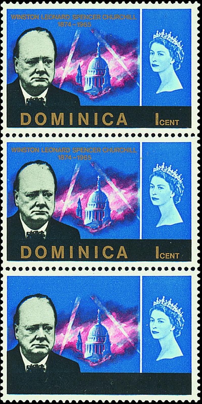 1966 Churchill 1c. vertical strip of three, the third stamp with variety gold omitted,, unmounted mint, fine and rare. S.G. 187a, £2,000. Photo,