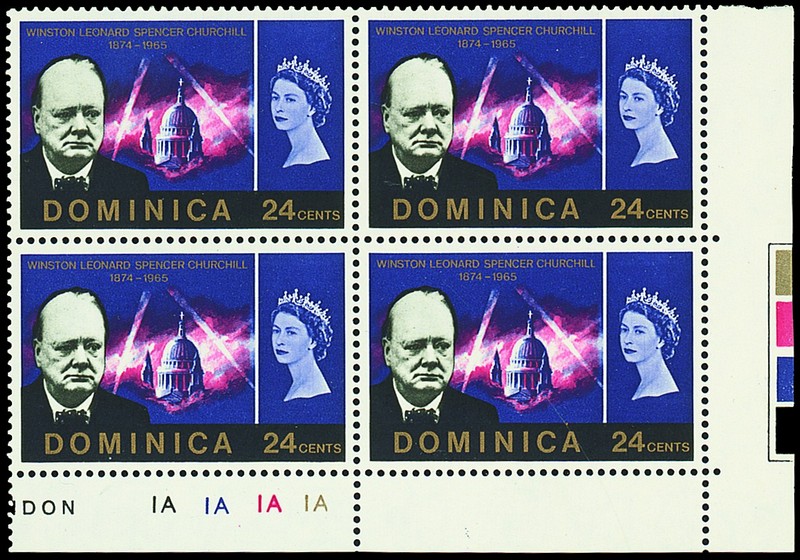 — 24c. block of four from the lower right corner of the sheet with plate numbers and colour bars, variety watermark inverted, unmounted mint, fine. S.G. 190a, £640+. Photo