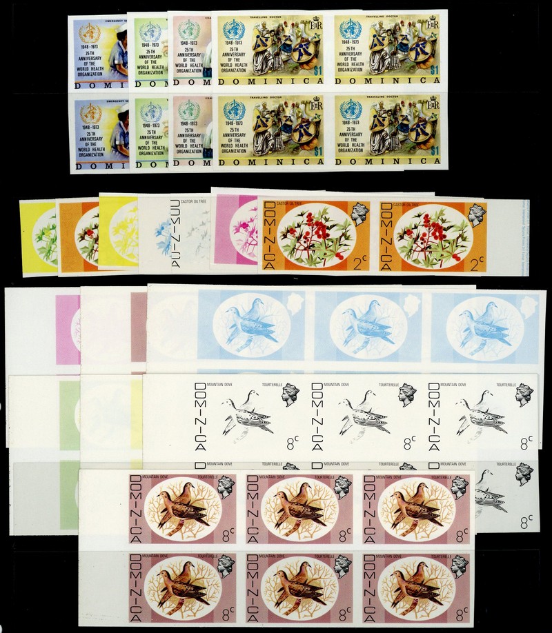1973 World Health Organisation 30c., 35c., 50c. and $1 imperforate blocks of four, 1975 2c. Castor Oil Tree progressive proofs (7) in horizontal pairs, 8c. Mountain Dove progressive proofs (7) in imperforate blocks of six; unmounted mint, fine. S.G. 384-387, 492, 497