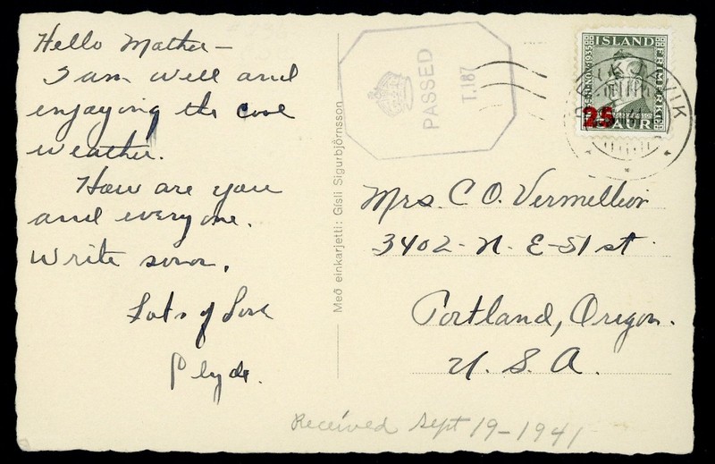 1941 "25" on 3a. grey-green, tied to picture postcard (5. Frà Hvalfiroi), from Reykjavik, dated 8 Aug. 1941, addressed to the United States, British Censor marking, fine and very scarce on card. S.G. 261