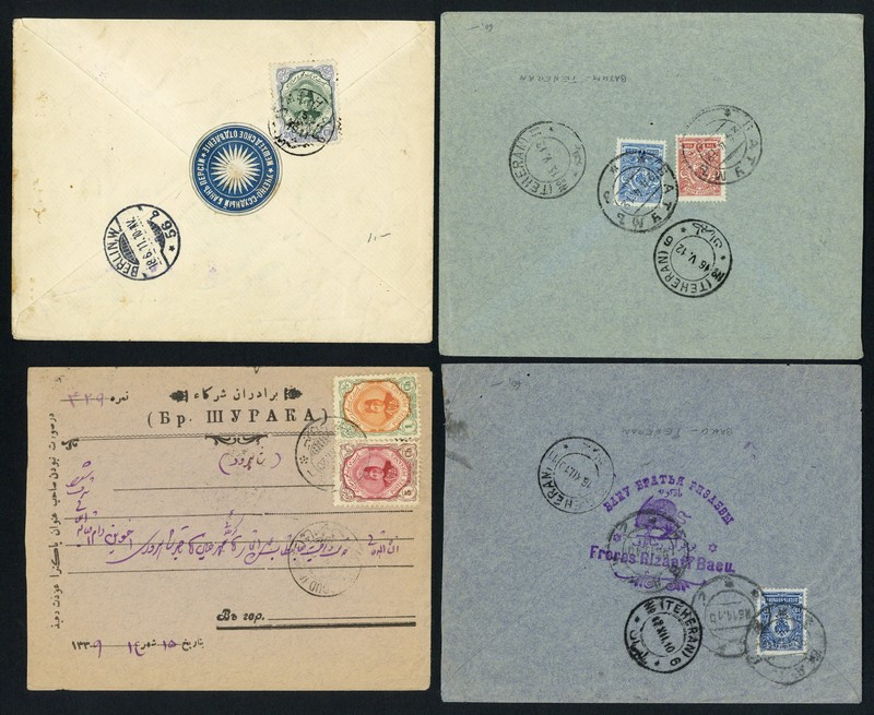 1888-1928, selection of twelve covers from the Caspian Sea region with a variety of Iranian and Russian frankings (one stampless and another with stamp missing), including 1943 Russian meter franking, registered, censored, etc., mixed condition