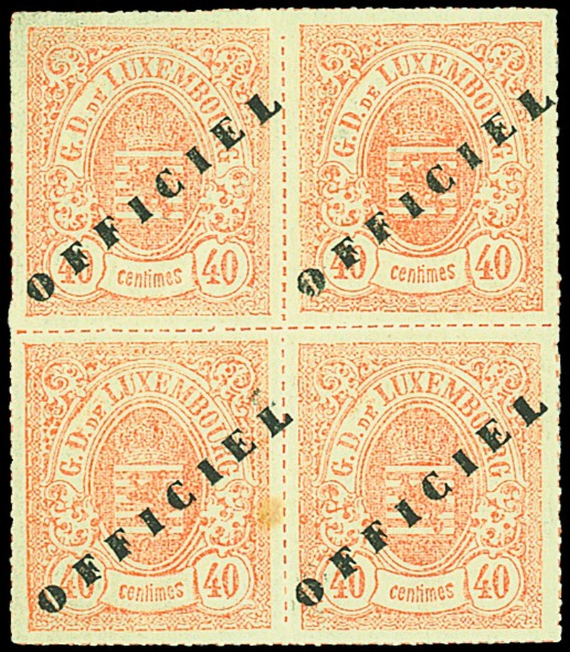 1878-80 rouletted in colour, Frankfurt impression 40c. pale orange, block of four with large part original gum (the lower pair remaining unmounted mint), small stain spot affecting the third stamp, fine. S.G. O105b, £2,600+. Photo
