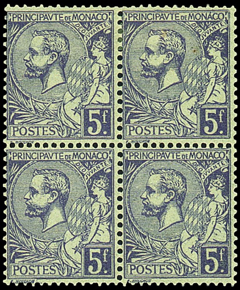 1901-21 5f. mauve, block of four, large part original gum (the lower pair remaining unmounted mint), fresh and fine. S.G. 28, £900+. Photo