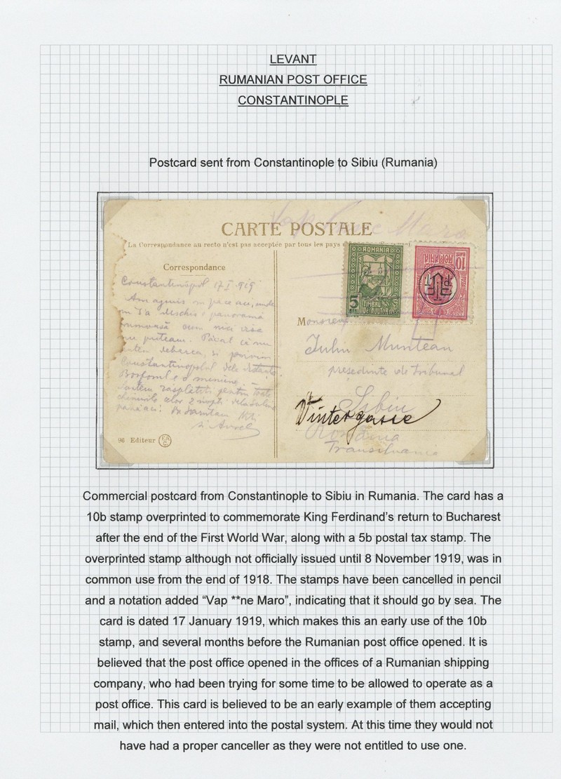 Post Offices in the Turkish Empire: 1919-21 collection on pages, fourteen stamps and seven covers or cards, including 1919 p.p.c. from Constantinople to Sibiu bearing Romanian issues, 1919 (Aug.) envelope to Para franked 5b., 10b., 15b., 1919 (Sept.) unaddressed cover franked 5b. and 10b. blocks of four, another franked 25b. and 40b. blocks of four, 1919 (Oct.) envelope to Bucharest franked 5b., 10b., 15b., 25b. and 40b., 1921 incoming card from Cluj, etc., also a few forgeries; good to fine