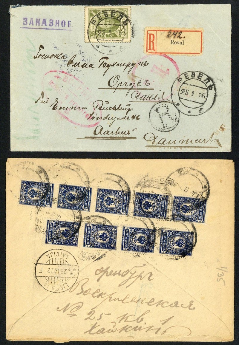 Selection of sixty-six covers and cards, many addressed to Denmark, including postal stationery, censored, registered, etc., mixed condition