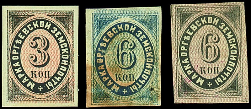 Ananief: 1886 5k., imperforate essay in black on rose; Orgheef 1881-82 3k. rose and black (2), 6k. rose and black, 6k. blue, 1882 3k. blue and brown, imperforate proofs; some faults. Photo