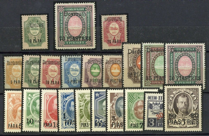 Mostly mint selection of forty-two on stockcards, including 1900-10 4pa. on 1k. surcharge inverted (used), 1909-10 individual offices Kerassunde 70pi. on 7r., Mount Athos, Smyrne 70pi. on 7r., Trebizonde set of nine, Beyrouth 10pa. on 2k. surcharge inverted, 70pi. on 7r., Dardanelles 20pa. on 4k. surcharge inverted, set of nine, 1913 Romanov 50pi. on 5r., part original gum except one, fine