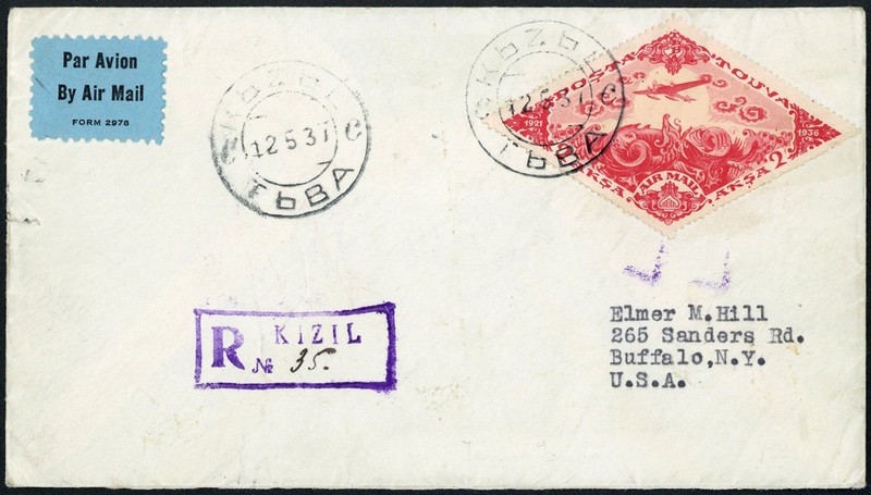 1936 Anniversary of Independence Air 2a. rose-red and cream, tied to envelope registered from Kizil to New York dated 12 May 1937, transit and arrival markings on reverse, fine and extremely scarce on cover. S.G. 107. Photo
