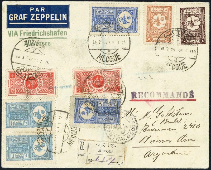 1934 (11 July) envelope registered from Mecque to Buenos Aires, intended for the fourth 1934 Zeppelin South America flight, bearing 1927 5pi., 10pi., 1934 Proclamation 1 0189g. (2), 3½g. (2, one with surface fault) and 1934 Charity ½g. (2), green "VIA Friedrichshafen" cachet, on reverse transit datestamps of Djeddah (11.7), Port Taufiq (15.7), Alexandria (16.7) and Buenos Aires (11.8); a trifle soiled, extremely rare. Photo