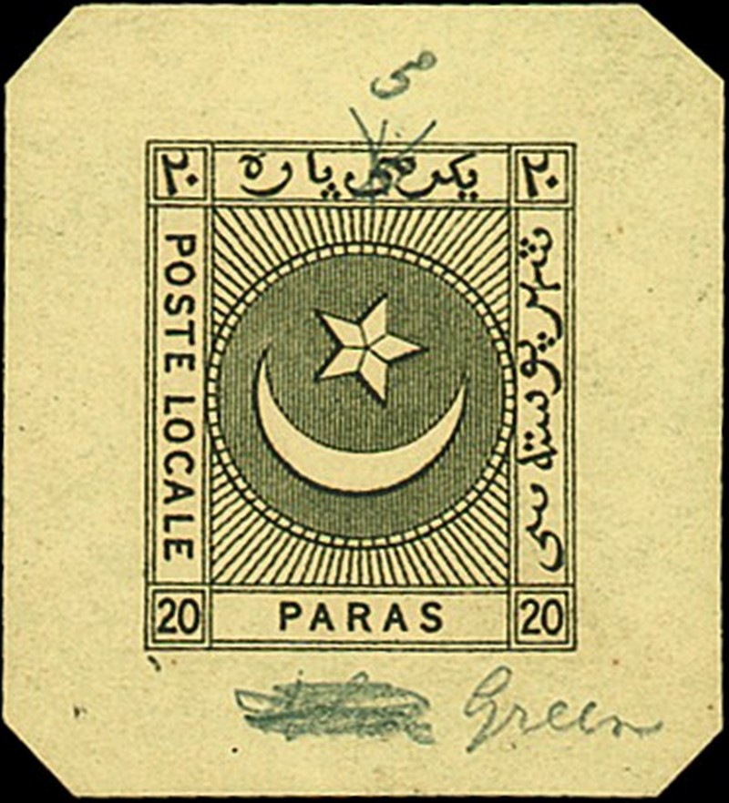 Lianos Local Post: 1865 20pa. die proof in black on thick paper with the rejected design showing "Sher Postassi" arabic inscription reading upwards at right and with pencilled correction to the arabic inscription at top, endorsed Green; fine and rare. Photo