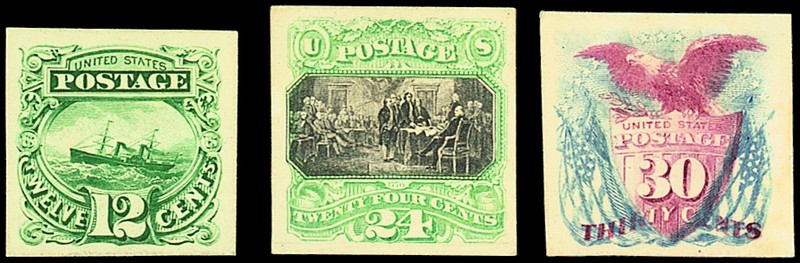 1869 1c., 2c., 6c. (2), 12c., 24c. and 30c. (2) imperf. plate proofs on card, chiefly fine. Scott $820. Photo