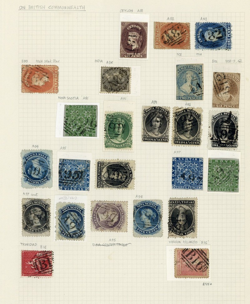 A collection of Mailboat Numeral Cancellations on a variety of values, comprising Ceylon A81, A82 (2) and B89, India A86, New Zealand A?? and B12, Nova Scotia A91 (3), A92 (2), A94, A95 (3), A97 (5), A98 (2), Trinidad B1? and Virgin Islands B16; fair to very fine strikes