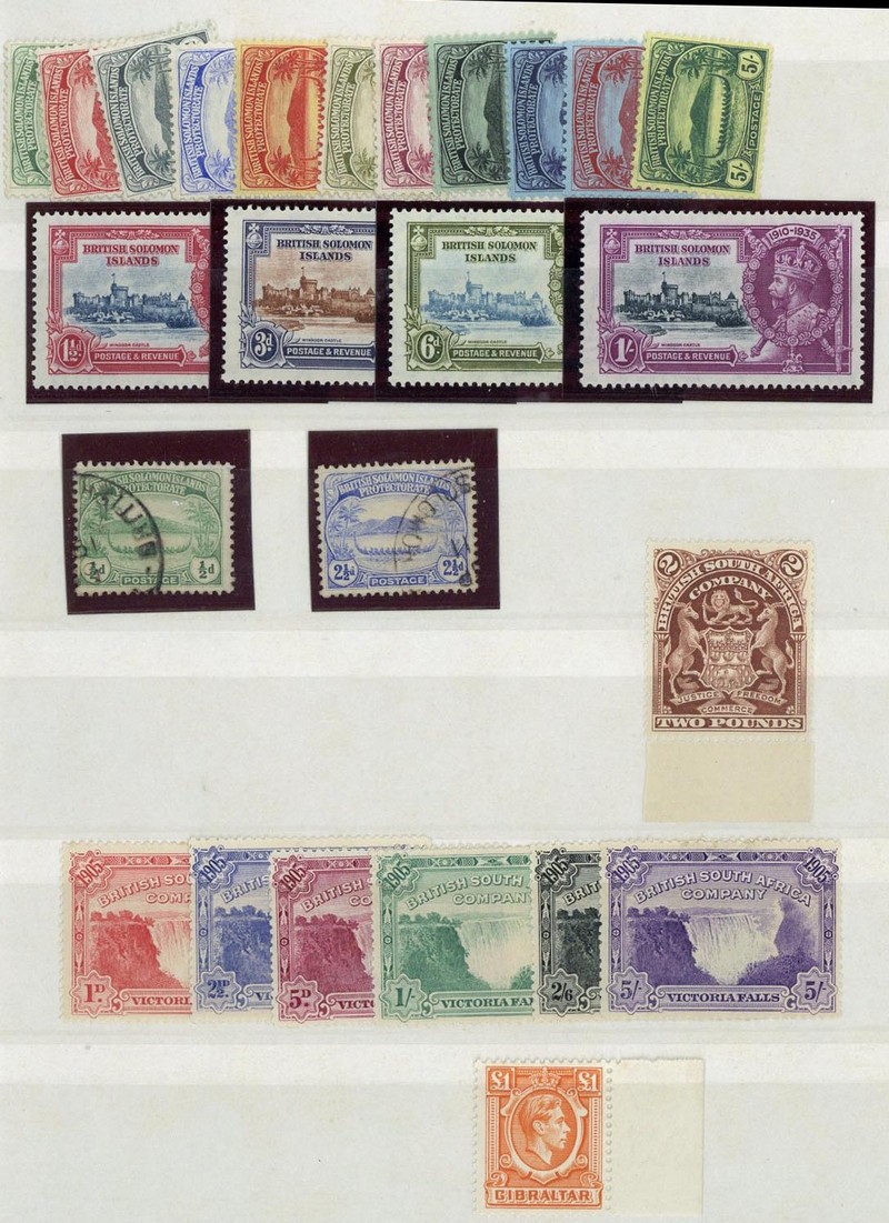 A selection of better items and sets in small stockbook which includes Basutoland 1938 set to 10/- and Silver Wedding 10/- in a corner block of four; Bechuanaland 1888 2/6d., 1913-24 2/6d. and 5/-, 1932 values to 5/- used; British Solomon Islands with small Canoe set, Falkland Islands 1952 set to £1; Natal 1902 £1.10 part gum; K.U.T. 1897-1903 3r. used; Rhodesia 1898-1908 £2 and 1905 Falls set; Swaziland 1933 values to 5/- and 10/- used; Great Britain K.E.VII 10/- mint and used, 1934 Re-engraved set unused and used, 1939-48 set to £1 plus some others