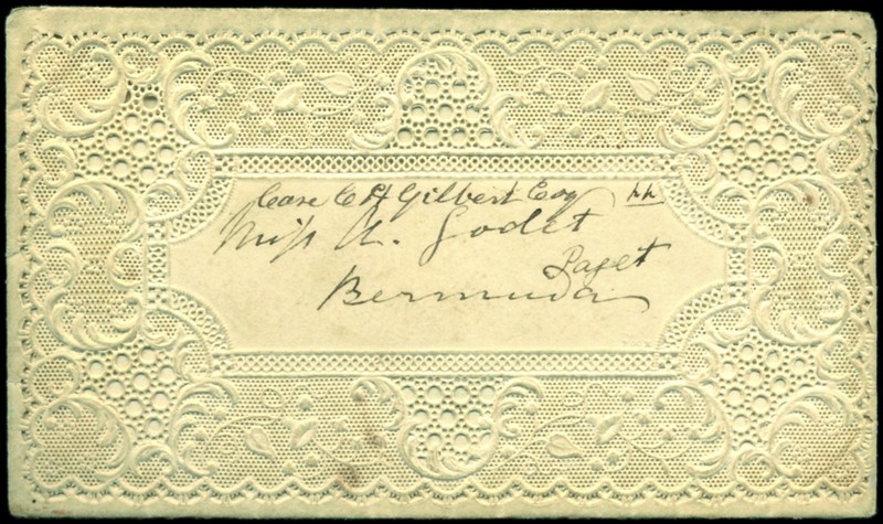 1851 beautiful, pierced paper lace envelope, addressed to Paget, on reverse fine red "hamilton/fe 14/1851/bermuda" c.d.s., with the accompanying pierced paper lace note paper headed St. Valentines 1851 with a long, loving message (transcript enclosed); some minor faults and age staining not detracting from this charming and important Valentine. Photo