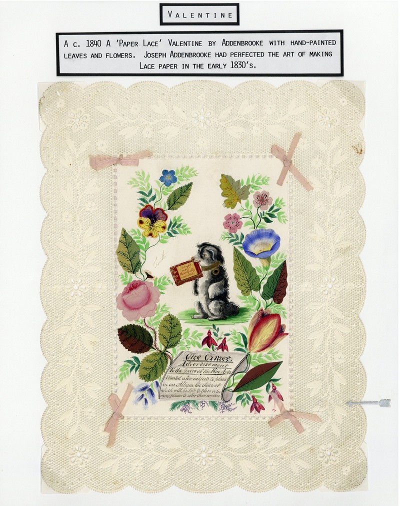 — 1840-50 (c.) three cards, including paper lace card with handpainted leaves and flowers, dog holding message; 1847 (c.) delicate paper lace card with hand painted flowers in central panel; a few small faults