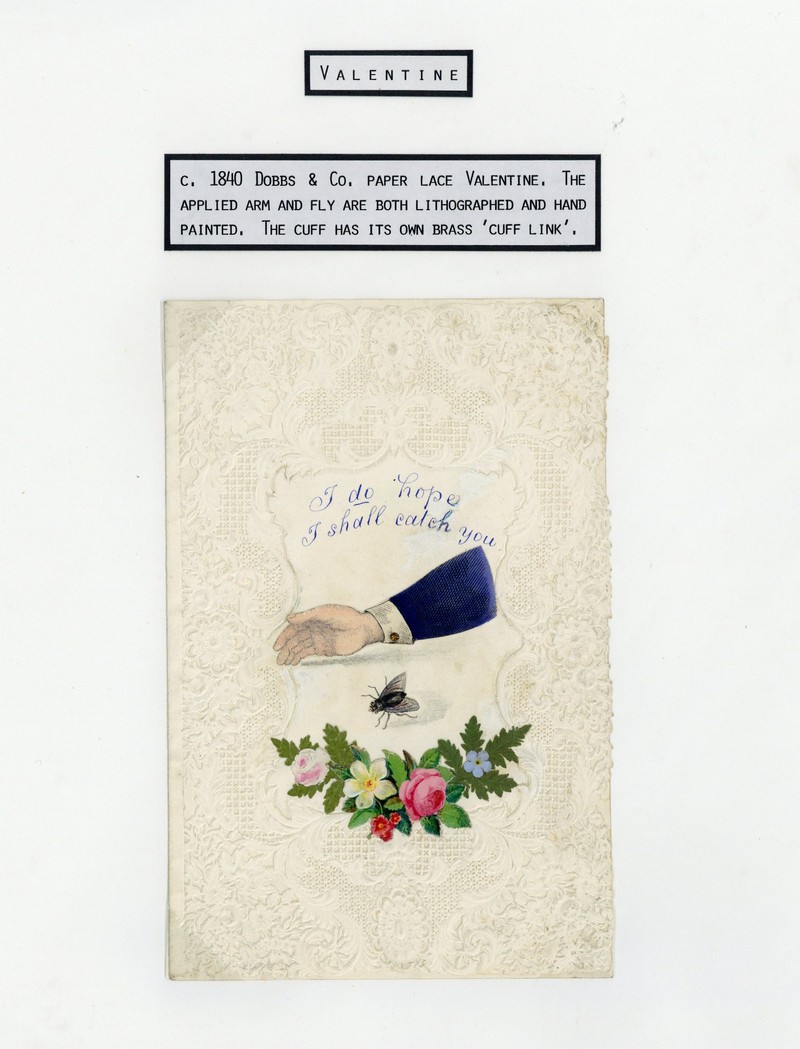 — 1816-60 (c.) ten paper lace cards, including card with applique love birds and real feathers, 1835 (c.) "Fountain of Happiness" with applique flowers and birds, 1840 (c.) with applique hand, fly and flowers, 1850 (c.) with paper lace doors opening to reveal a loving message, 1855 (c.) accrostic card with message, the first letters of each line spelling "LOVE", 1850 card with applique portfolio opening to reveal a musical wish, etc., chiefly fine