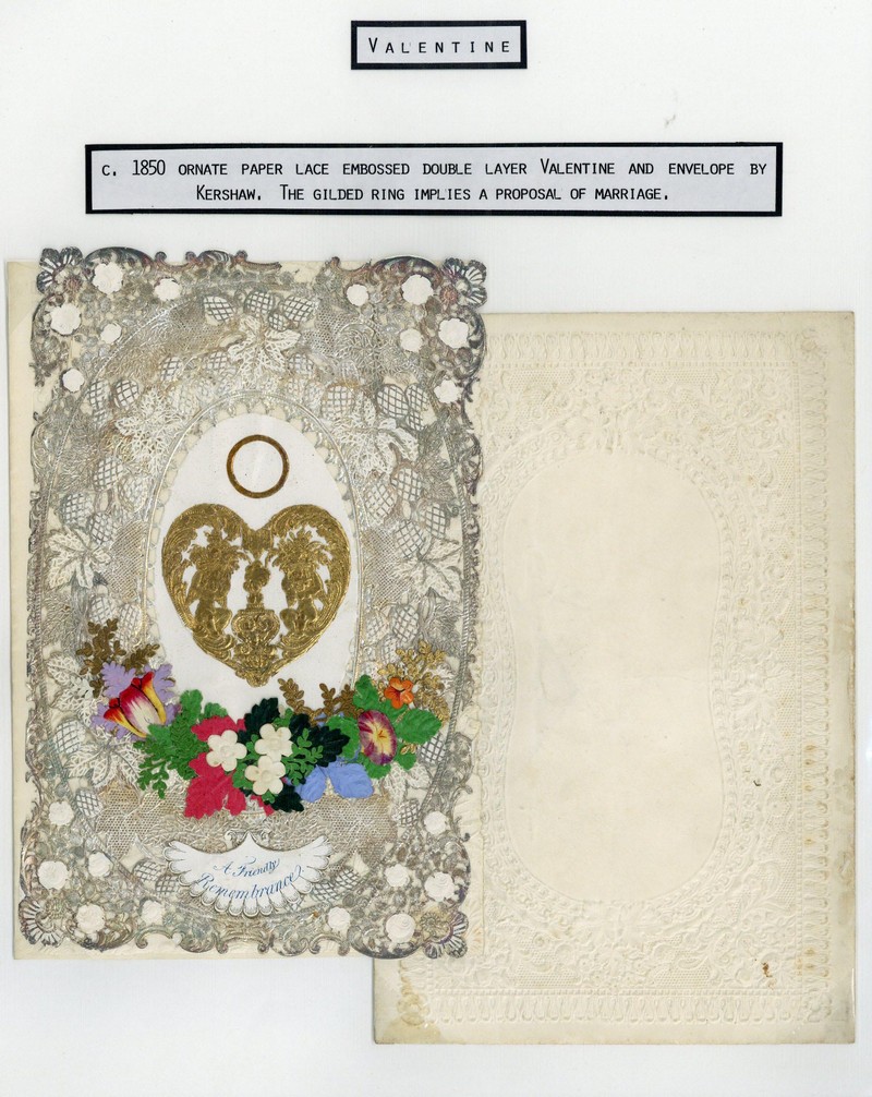 Kershaw: 1843-1860 (c.) nine cards (three with accompanying envelopes), including 1840 (c.) embossed card with hand coloured and applique rings, bird and flowers; 1843 (c.) embossed, hand coloured card depicting a young lady tending a fallen Cupid, 1845 (c.) embossed card decorated with pearls and silver wire, 1845 (c.) card with applique Cupid on silk panel; 1845 (c.) paper lace card with applique envelope with a loving message, etc., chiefly good to fine
