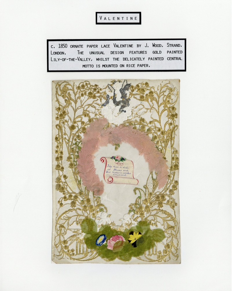 Wood: 1849 (c.) ornate paper lace card with gilded frame surrounding a central design of two lovers; 1859 ornate paper lace card with applique flowers and gold painted Lily of the Valley, fine