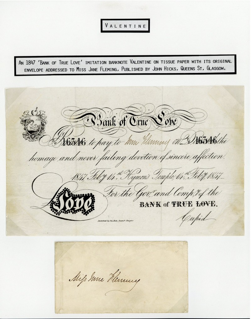 1847 "Bank of True Love" in the form of a £5 note by John Hicks (folded) with envelope addressed to Miss Jane Fleming; 1860 (c.) "Lover's Banking Company" and "Court of True Love" Summons, fine