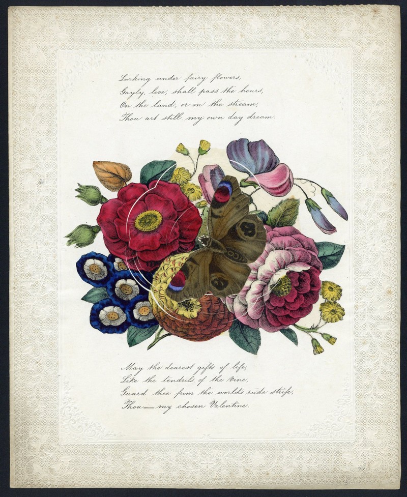 1840 (c.) paper lace card, depicting a butterfly over a basket of flowers, lifting to reveal Cupid in a burning heart (lifting thread missing), fine and attractive