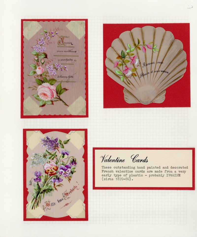 1870-90 (c.) three small handpainted cards on an early type of plastic (ivorine), also two "Love" cards; good to fine