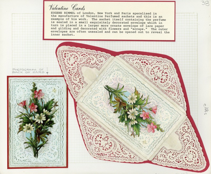 — 1860 (c.) E. Rimmel with applique flowers on both sides, also another, almost certainly by Rimmel with applique flowers on the front and on reverse an envelope opening to reveal the senders message