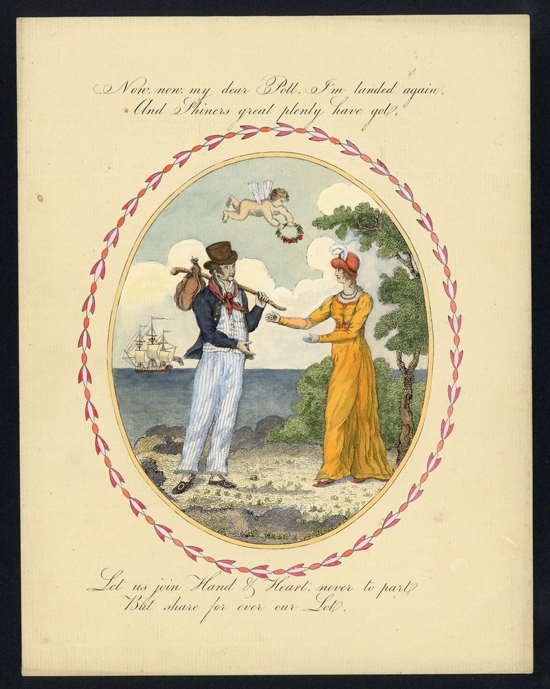 1860 (c.) two copper printing plates, the first depicting a parting couple, sailing boat and cupid, the second depicting a soldier parting from his loved one with a horse, with prints taken from the plate, the second partly coloured, one plate with surface fault