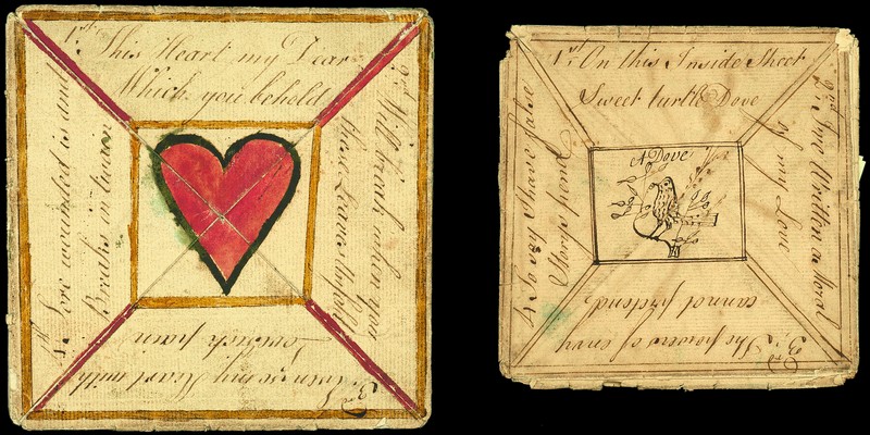 An unusual pair of very early hand made Valentines, probably from the late eighteenth century, one is hand painted but both are of very similar format and written by the same hand; fine for their age. Photo